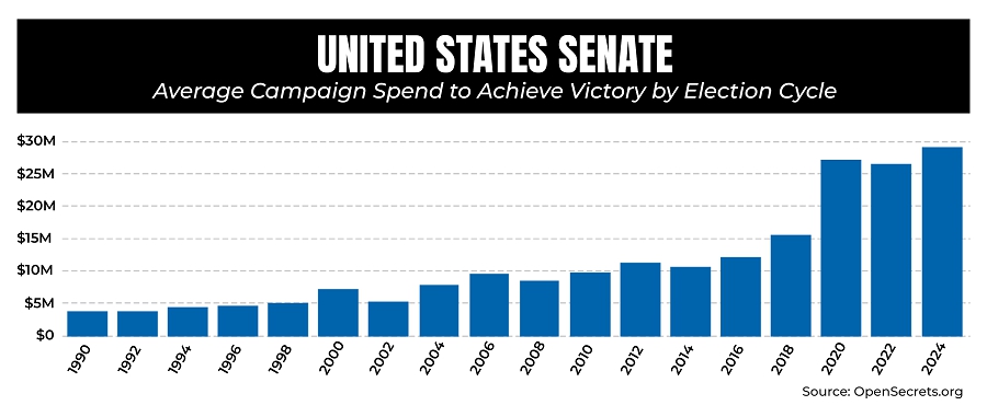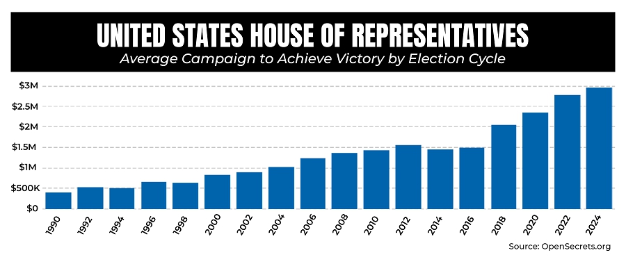 Spending on elections in the United States has increased significantly. According to data from OpenSecrets, the average winner of a federal legislative election in 1990 spent $407,556 on their campaign for the House and $3,870,621 on their campaign for the Senate. By 2010, the average spend had roughly tripled, with House winners spending an average of $1,439,997 and Senate winners spending an average of $9,782,702 on their campaigns. The numbers increased seven-fold by 2022, when the average House winner spent $2,789,859 and the average Senate winner spent $26,525,065 on their campaigns. According to OpenSecrets, on an inflation-adjusted basis, total expenditures on presidential and congressional elections increased from $5.6 billion in 2000 to $18.3 billion in 2020.